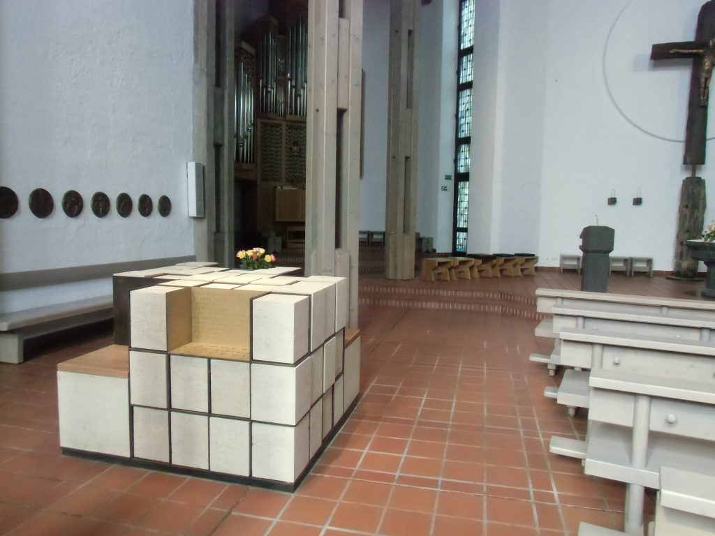 Dort ist im Kirchenraum, neben den Bänken verteilt, Platz für die Verstorbenen: Columbarien ergänzen den neu gestalteten heiligen Raum mit Platz für Urnen und Blumen und Namensschriftzüge. Ein mutiges Projekt!